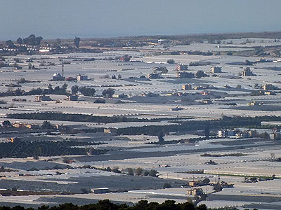 sind nicht etwa Schnee, sondern die zahllosen Gewächshäuser, die