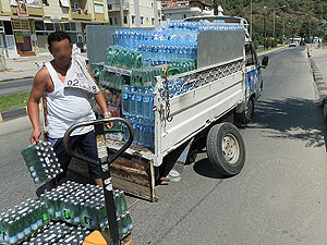 Wasserflaschen beladen war. Als er dann vor dem Lager über die