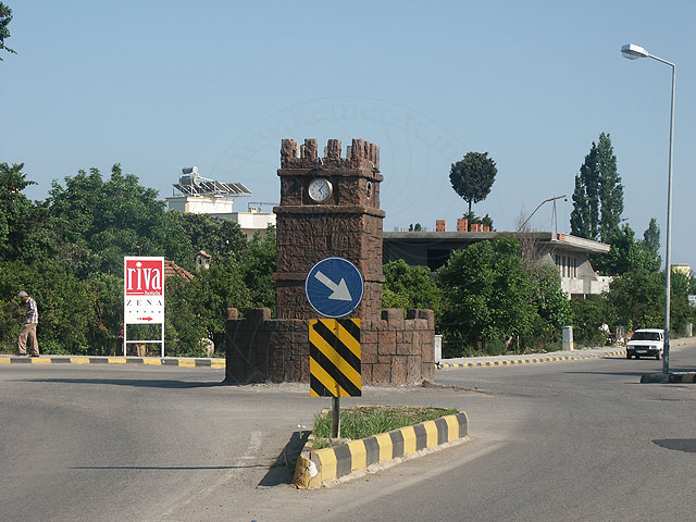 „Pseudo-Kreisverkehr“ mit Uhrenturm gesetzt. Um die Uhrzeit