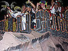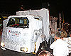 Tieflader, mit mächtig vielen Leuten sowie Trommlern und Pfeifern