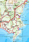 schlängelt sich in vielen Kurven durch ein wildes Vorgebirge bergab in Richtung Küste. An