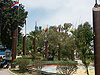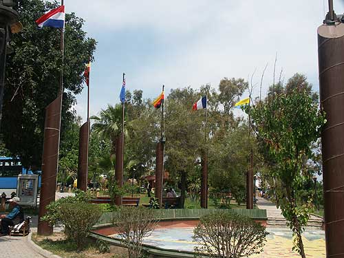 einen kleinen Platz im Zentrum von Kemer, gegenüber dem neuen Meydan (Uhrenturm), Fahnen aus verschiedenen Ländern, die den