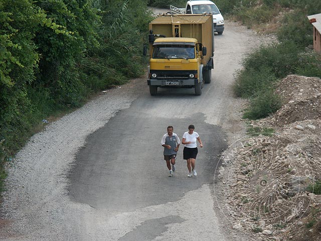 wieder nette Fotomotive, wie die Jogger, die vor dem Müllauto