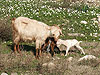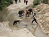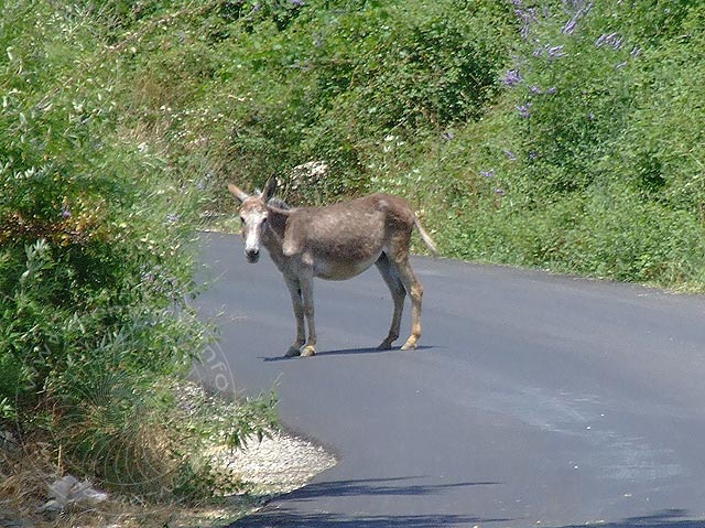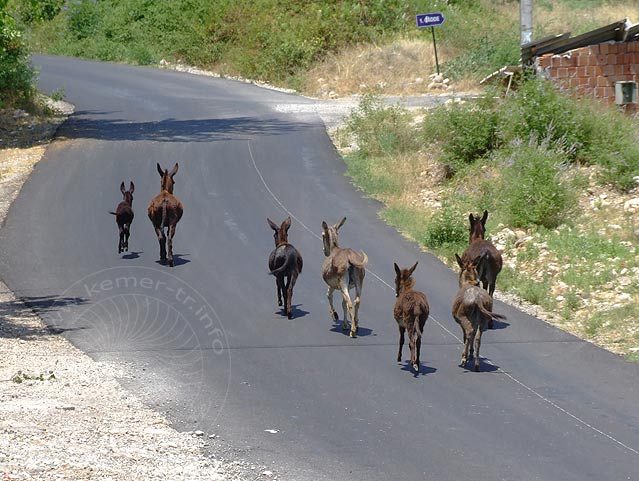 auf eine Herde Esel vor dem Haus, die sich anscheinend von dem