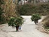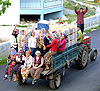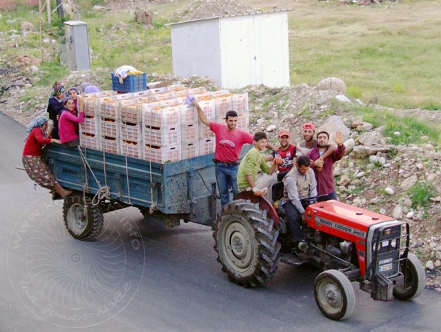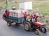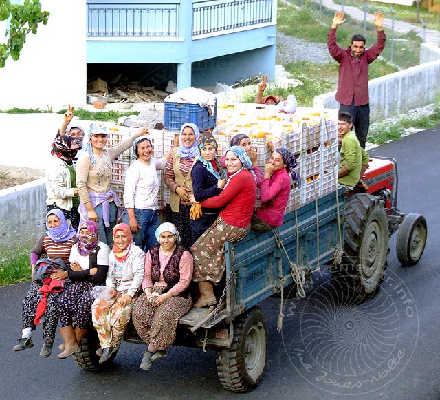 Obstpflücker, die uns von ihrem Gefährt glücklich zuwinken, denn