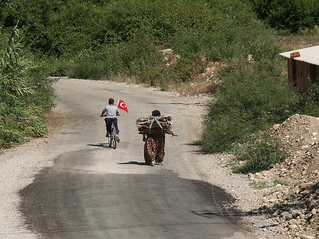 und der kleine Radfahrer, eine türkischen Fahne schwenkend.