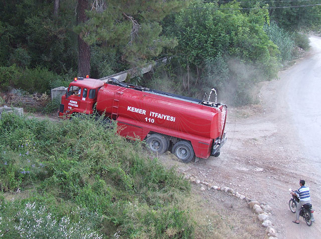 bekämpfen. Die angerückte Feuerwehr aus Tekirova ist hier nur zu