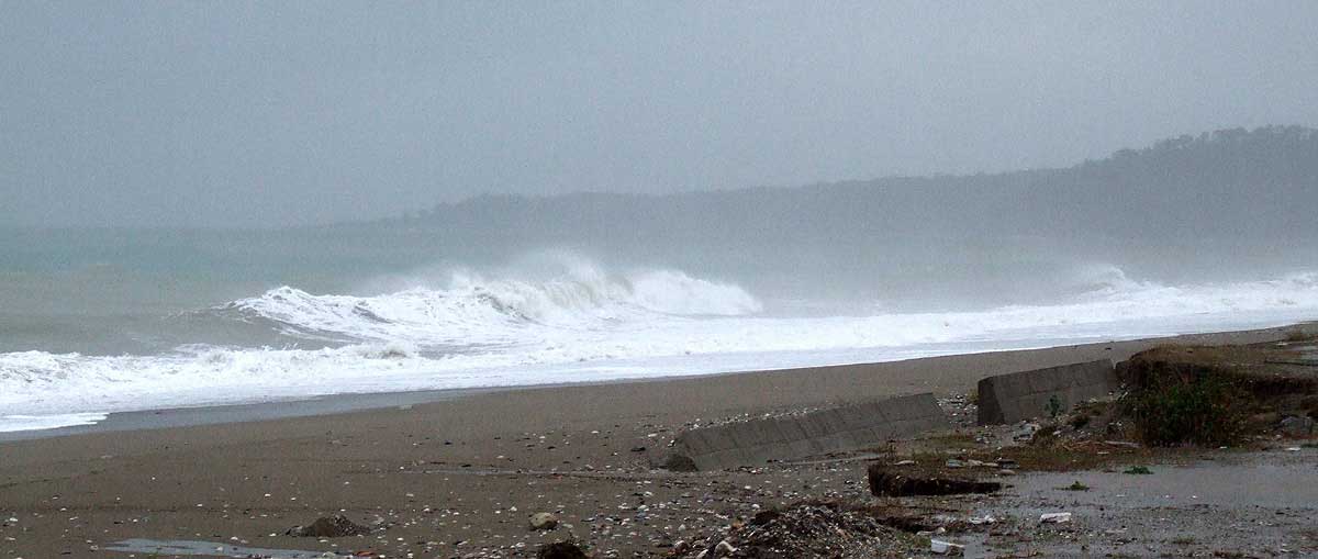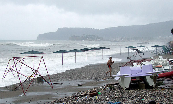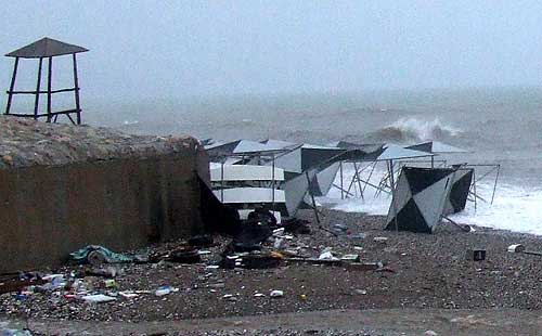 überflutet. Die Sonnenschirme am Strand wurden durch hohe Wellen